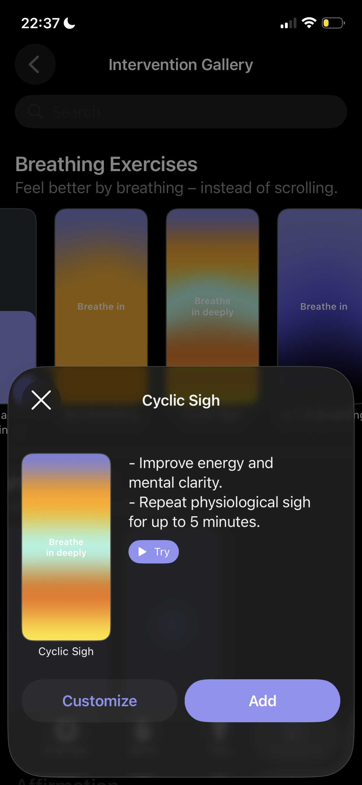 With Breathing Prompts you can adjust the text of your breathing intervention fitting to your situation. You can add Default prompts as well as app-specific prompts. Add things you want to think or be aware about, before opening an app –