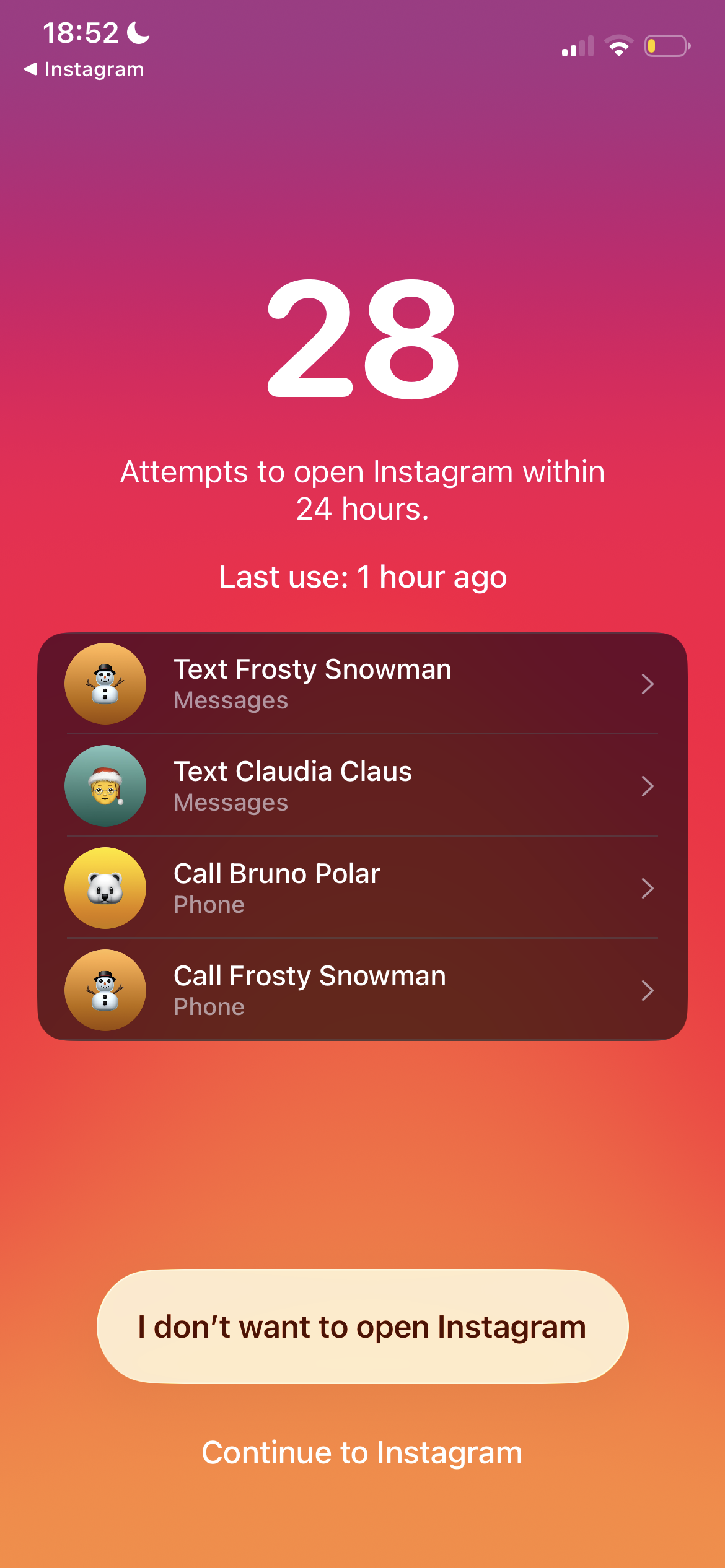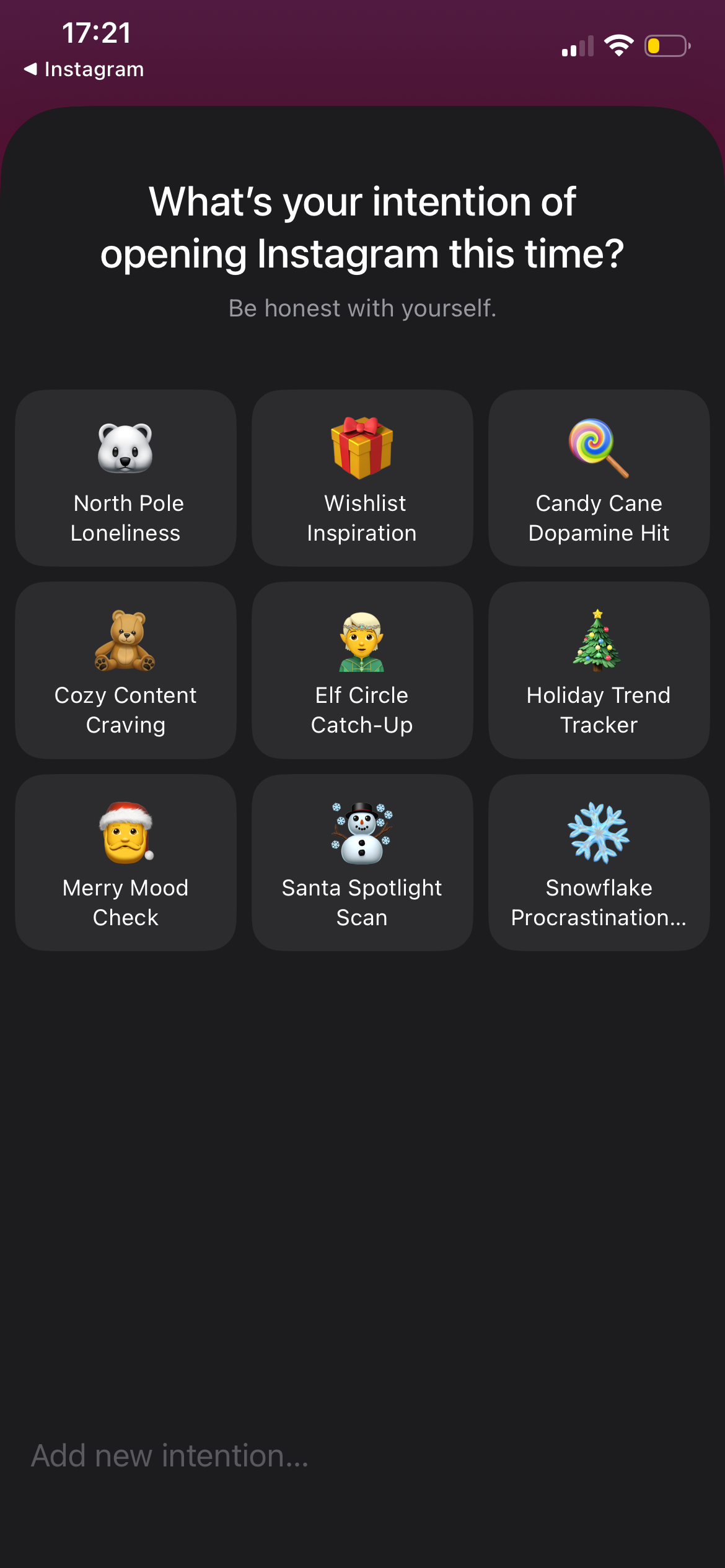 🌟 The Delayed Intervention will get you out of the app without intervening before – a fixed point for orientation like the Northstar. Perfect to reply to short messages from Mrs. Santa on Insta without getting lost in the latest beard and moustache trend reels.