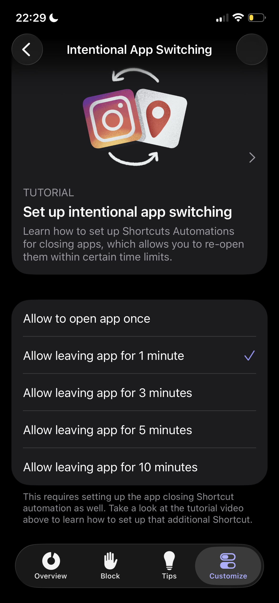 The Intention Tracking Feature will ask you for your intention everytime you continue to open an app after the initial intervention.