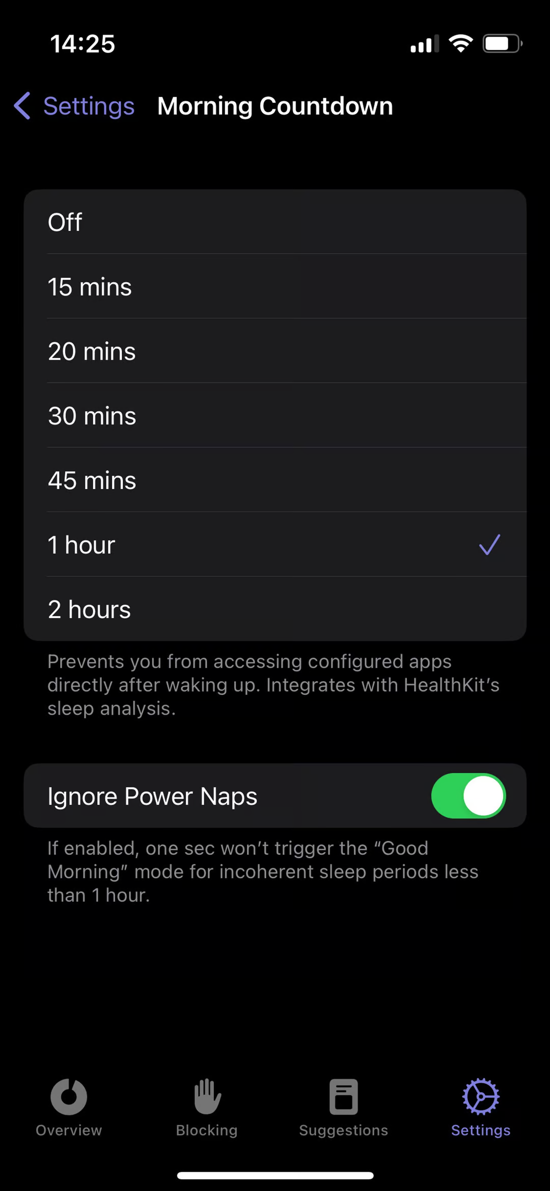 Open one sec’s Customize tab and select Good Morning Countdown. Select a time interval that one sec should block apps after waking up.
