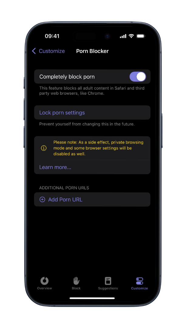 one sec also contains an automatic adult content detox, that can be expanded with your own custom urls as well. You can even lock the settings so you can’t modify them later.