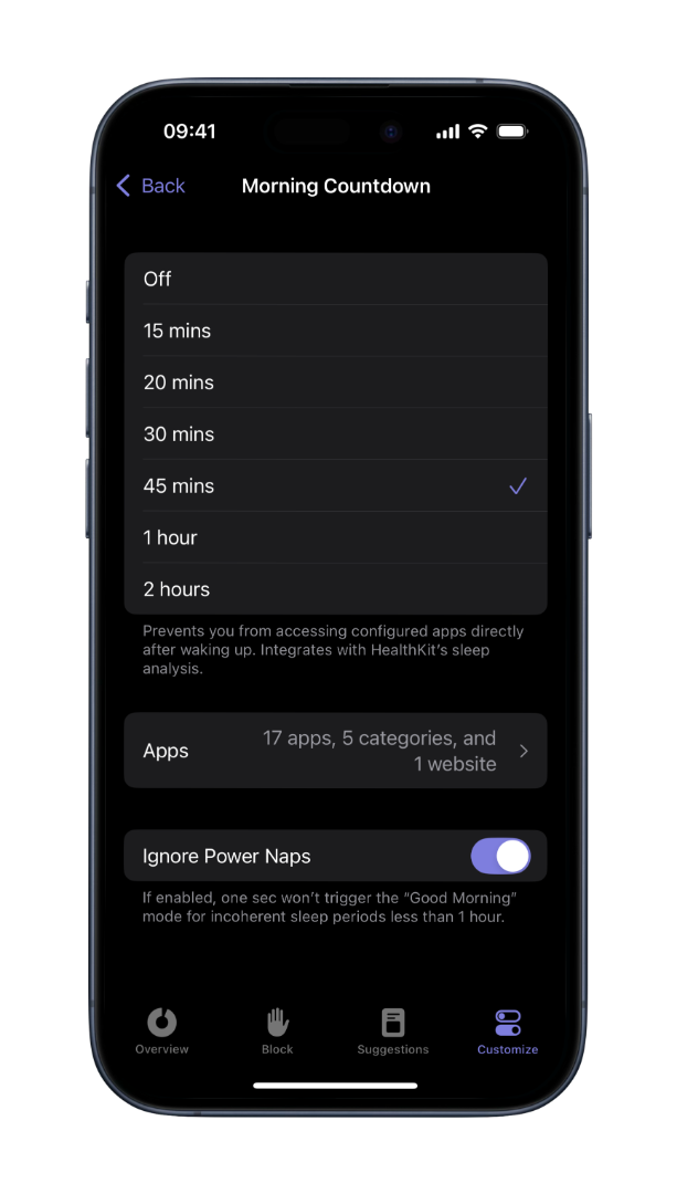 You can also connect one sec to Apple’s Health app, in order to detect when you’re waking up. one sec will then block selected websites for the specified time interval: so you can start your day screen-free.