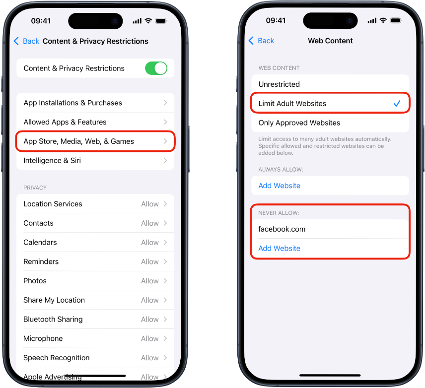 You can remove or edit blocked sites anytime by revisiting the Never Allow list under Web Content.