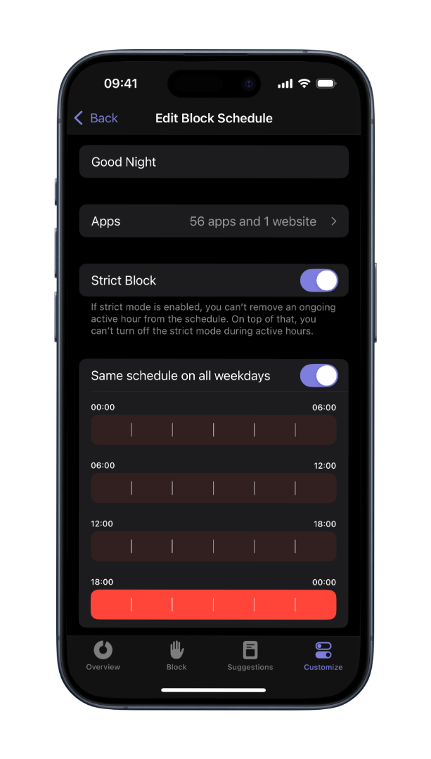 Open one sec’s Customize tab and select Block Schedule. Add websites and select all hours for which you’d like the block to be active. You can also set up different schedules for each day of the week if necessary.