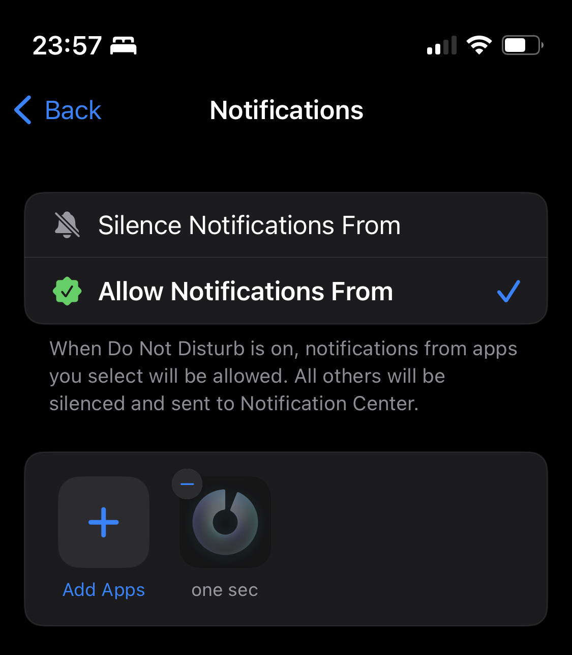 Tap on Apps (and make sure “Allow Notifications From” is selected) and add one sec to the list of apps.