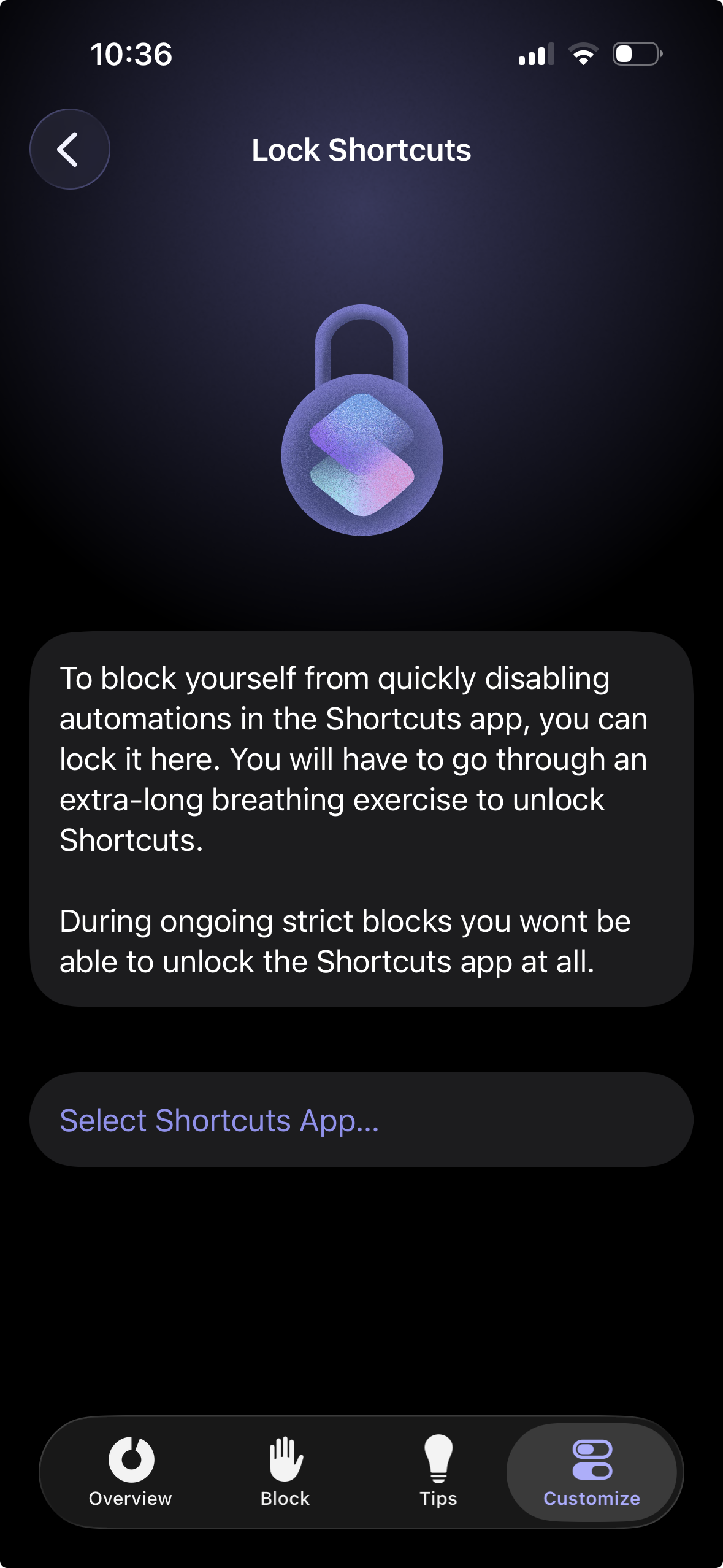 To make sure that you can’t turn off any Automations in the Shortcuts app, you can make use of one sec’s feature “Shortcuts App Lock” under “Cheat Lock”.