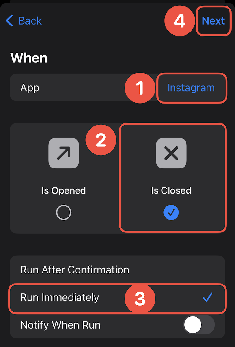 ⚠️ Only select one app here. A separate automation is required for each app. Be sure that only “Is Closed“ is selected.