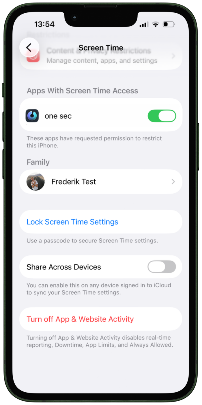 With recent iOS updates, Apple allows Screen Time settings to be locked with a passcode. Once enabled, Screen Time permissions for one sec cannot be changed — which means one sec cannot be disabled or deleted.